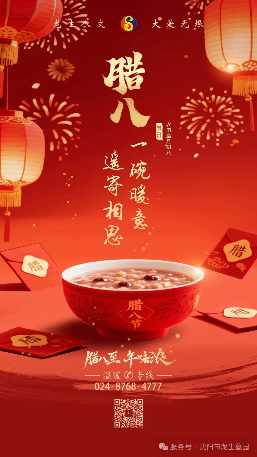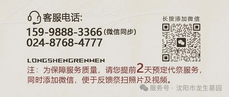 腊八 。 腊月初八 岁至腊八,年味始浓。这一天,家家户户的炉火,都慢炖着一锅跨越千年的暖意。那升腾的,是五谷的芬芳,更是沉淀在古老习俗里,对先人的追思,对团圆的企盼,对来年诸事“粥”全的祈愿。 过了腊八就是年 The Laba Festival “过了腊八就是年”,在这被温暖香气包裹的日子里,思念也常常会变得格外绵长。沈阳龙生墓园深知,这世间最暖的陪伴,莫过于“我懂你所念,我应你所需”。 若您因故无法亲至,我们的“代客祭扫”服务,便是这寒冬里一份温暖的承诺。我们会以最庄重的心意,为您传递思念,让那一份未曾迟到的牵挂,跨越山海,如期安放。 我们的服务,恰如这碗粥的温度,细腻、妥帖而周全: “代”您抵达,让思念不缺席:若您因路途或事务无法亲临,只需提前告知,我们将郑重代为准备,在您指定的时间,以庄重、恭敬之心完成祭扫仪式,并第一时间向您传递现场讯息,让您的心意准时、完整地抵达。 La Ba 全程守护,让托付有回响:从沟通需求到仪式完成,我们注重每一个细节。祭品的选择、现场的布置、仪轨的完成,皆以尊重与专业为念,让每一份托付,都得到真诚而温暖的回应。 腊八代祭服务套餐 预订方式 NEW YEAR - 代祭扫预订方式 1、拨打下方客服电话或添加客服微信预定 腊八吉祥 La Ba - 腊八是团聚的序曲,温暖是此刻的主题。愿您与家人围炉闲话,共品一碗暖粥,身暖,心更暖。也请记得,无论何时何地,龙生始终是那份您可托付的、温暖而笃定的陪伴。 龙生人文纪念园,以心相伴,让爱绵延。 让专业的我们,完成您温暖的嘱托。 提前预约,让思念如期抵达。 龙生人文纪念园 以专业承载托付,以温暖守护思念